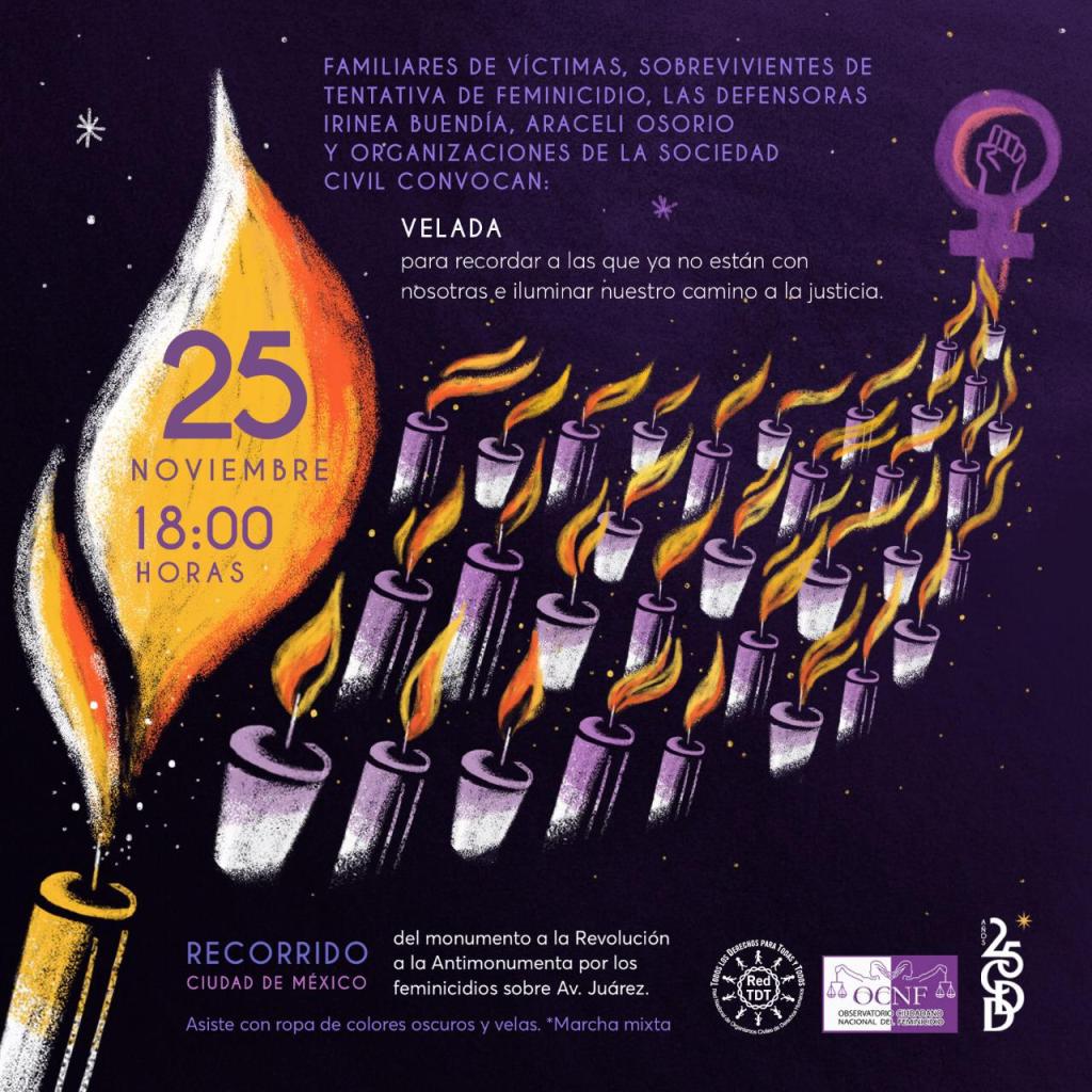 La cita es a las 18:00 horas este 25 de noviembre en el Monumento a la Revolución para hacer un recorrido que culmina en la «Antimonumenta por los Feminicidios» sobre la Avenida Juárez. Nos piden llevar ropa obscura y velas o veladoras.