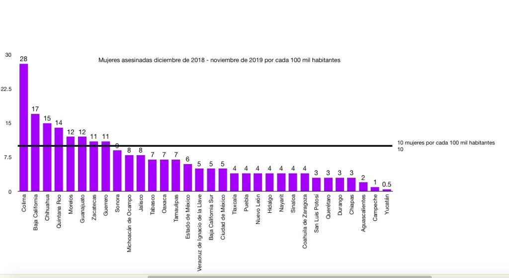 3.- Los estados con más feminicidios por cada 100 mil habitantes son Colima, Baja California, Chihuahua, Quintana Roo y Morelos que también tiene una epidemia de violencia según la Organización Mundial de la Salud (OMS). Tienen tasas de más de 10 mujeres asesinadas por cada 100 mil habitantes.