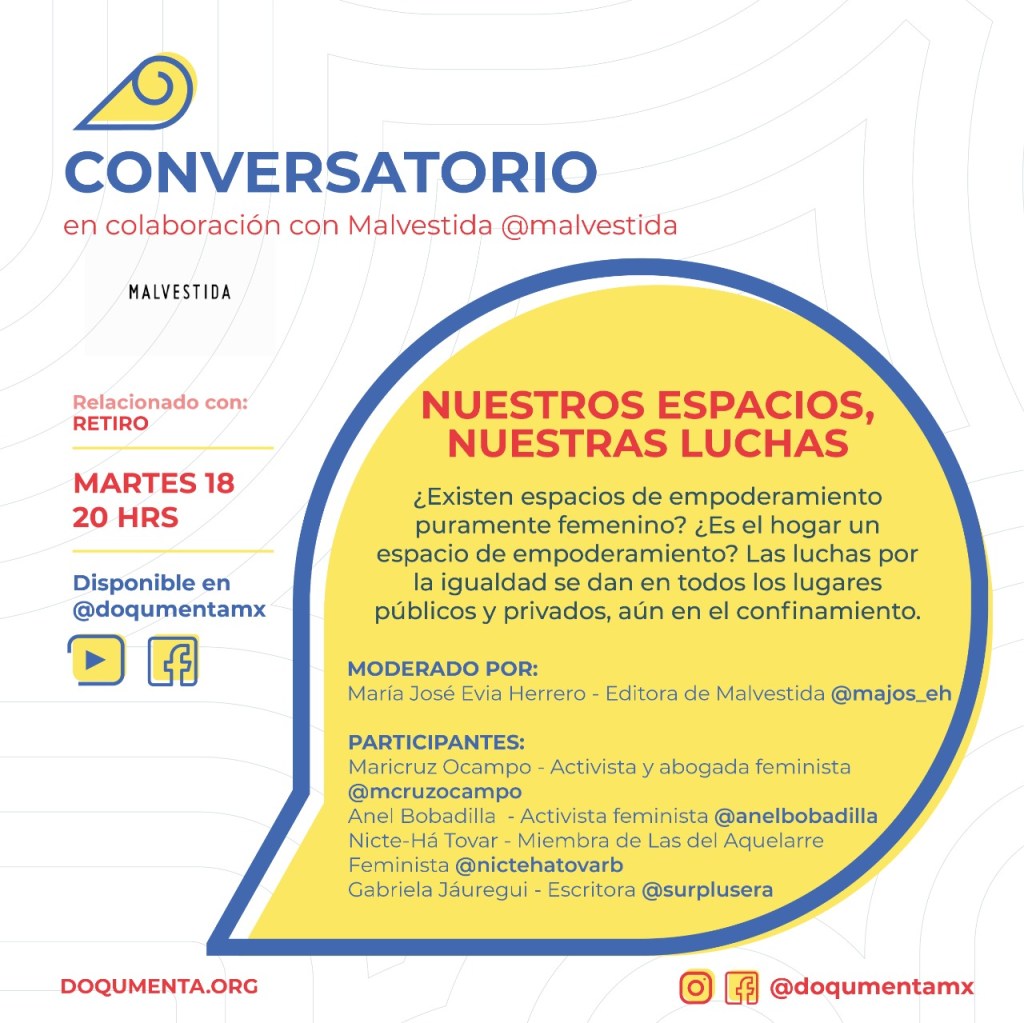 El día martes 18 de agosto en punto de las 20:00 hotas, dará inicio el Conversatorio Nuestros espacios, Nuestras luchas, en relación a Retiro, documental entre tres generaciones de mujeres que luchan por reafirmar su independencia en una sociedad paternalista es lo que nos expone la íntima mirada de Daniela Alatorre en su documental Retiro (2019) más datos del Conversatorio: participaran: Maricruz Ocampo, activista y abogada feminista, Anel Bobadilla, activista feminista, Nicte-Há Tovar, integrante de Las del Aquelarre Feminista, Gabriela Jauregui, escritora y modera María José Evia Hierro editora de Malvestida.